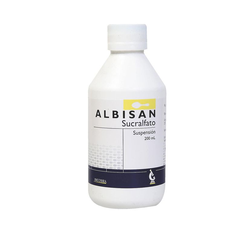 ALBISAN, proporcionado por LABORATORIOS INCOBRA SA, con Registro Sanitario 2015M-0016571, es un antiácido, antiflatulento y antiulceroso presentado en un frasco de 200 ml. Con su sustancia base SUCRALFATO, este producto ofrece alivio y protección eficaces para el tracto alimentario.