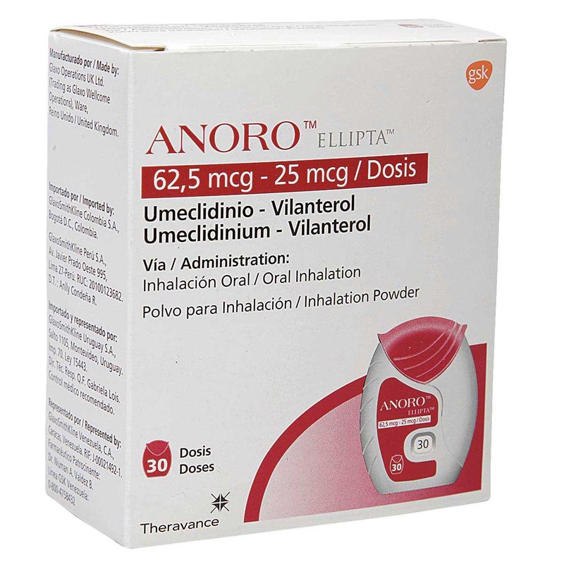 Suministrado por GLAXOSMITHKLINE COLOMBIA SA, Anoro es una combinación de umeclidinio bromuro y vilanterol trifenate, con registro sanitario 2021M-0016721-R1.
