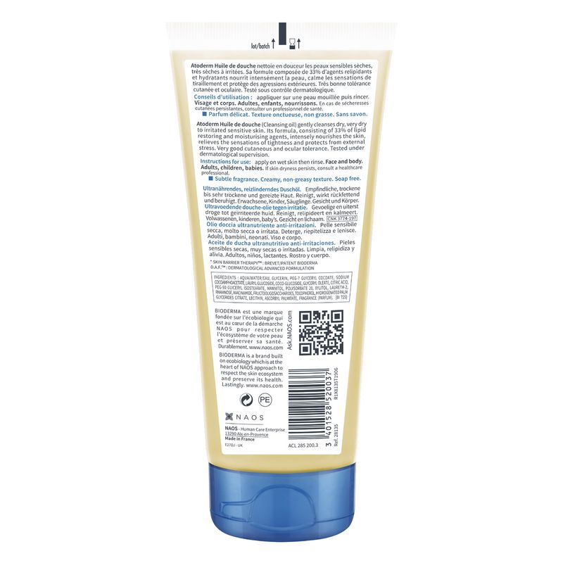 Aceite de ducha ultranutritivo para rostro y cuerpo para piel seca a muy seca. Limpia suavemente y brinda confort, 24 horas de hidratación desde la ducha. Sustituto del jabón.Apto para toda la familia. Hipoalergénico. Sin parabenos.