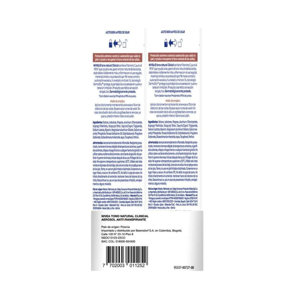 UNIDAD x 300 MLOF-Des Nivea Spray Clinical 150 ML x 2 un$ 43.000Mililitro a $143,33$ 43.000Pagando con Tarjeta Multiservicio.Agrega al carrito