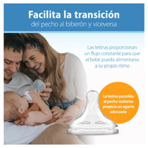 Lavar y esterilizar antes del primer uso. Colocar la tetina en el anillo del tetero y ajustar firmemente sin sobreapretar. Usar con líquidos templados o a temperatura ambiente. Diseñada para flujo medio, ideal para bebés desde 3 meses. Después de cada uso, lavar con agua tibia y jabón o en lavavajillas (rejilla superior) y dejar secar completamente. Revisar regularmente y reemplazar si presenta grietas, deformaciones o desgaste.