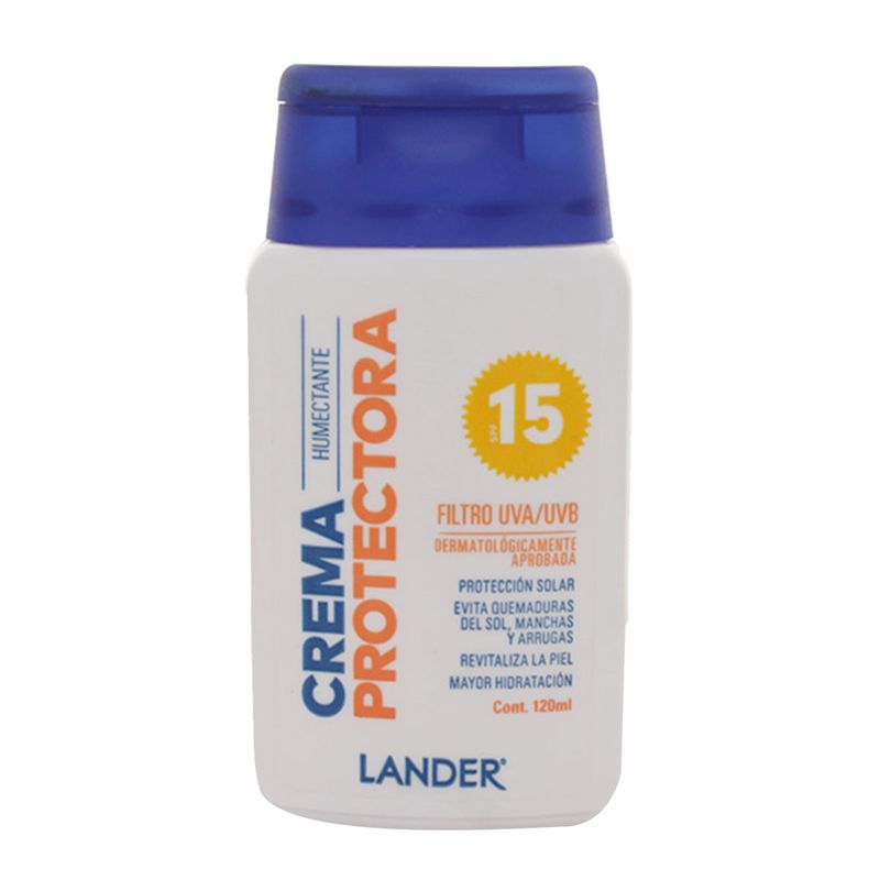 Crema Humectante Protectora SPF 15 LANDER. Es una crema que le brinda protección Solar con filtro UVA/UVB, aplicándola diariamente despúes del baño y durante el día cuantas veces sea necesario en cara, cuello y manos con suaves masajes, esparciéndola uniformemente en la piel dejándola suave y delicadamente humectada. Es una crema que esta clínicamente aprobada por un laboratorio, lo cual nos garantiza que se trata de una crema que maneja los mejores estándares de calidad.