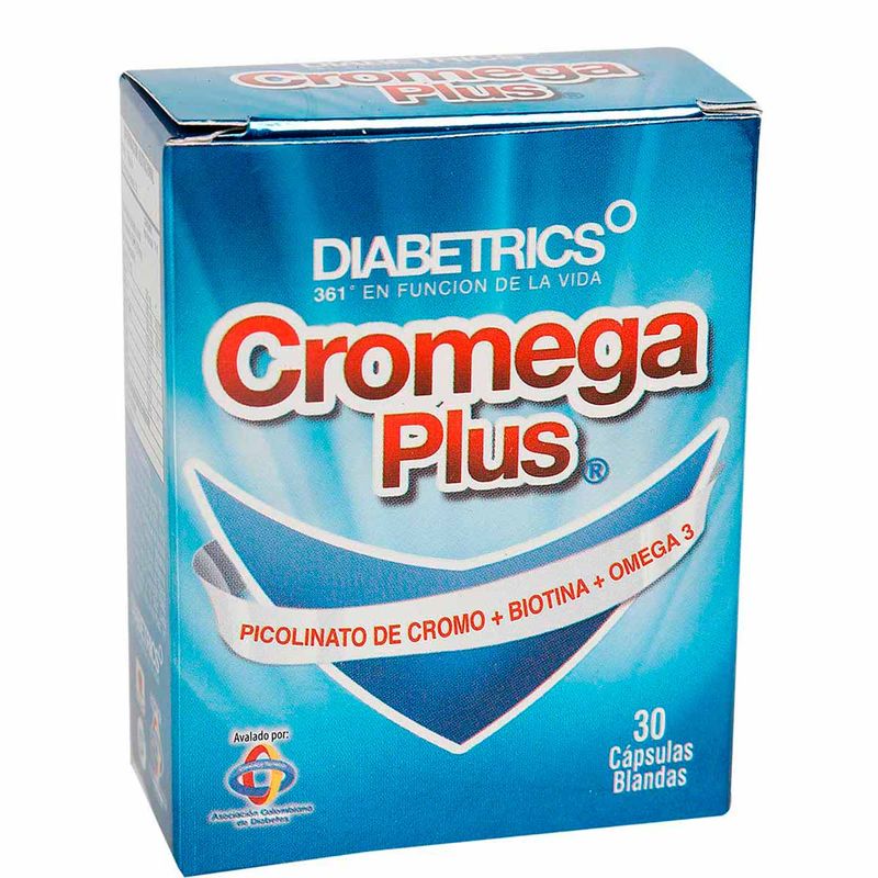.Cromega Plus Cápsula Blanda. . Descubre el bienestar integral con Cromega Plus Cápsula Blanda de Diabetrics Healthcare. Este multivitamínico para adultos, con Registro Sanitario SD2014-0003179, te brinda una fórmula única para potenciar tu salud. . Cromega Plus está diseñado para ofrecer beneficios completos a tu cuerpo. Las cápsulas blandas contienen nutrientes esenciales que apoyan la vitalidad diaria, contribuyendo al correcto funcionamiento del organismo y proporcionando un impulso energético. . Integra Cromega Plus en tu rutina diaria para aprovechar al máximo sus beneficios. ¡Optimiza tu bienestar con este complemento de Diabetrics Healthcare! Recuerda, lee detalladamente las instrucciones del empaque antes de usar.