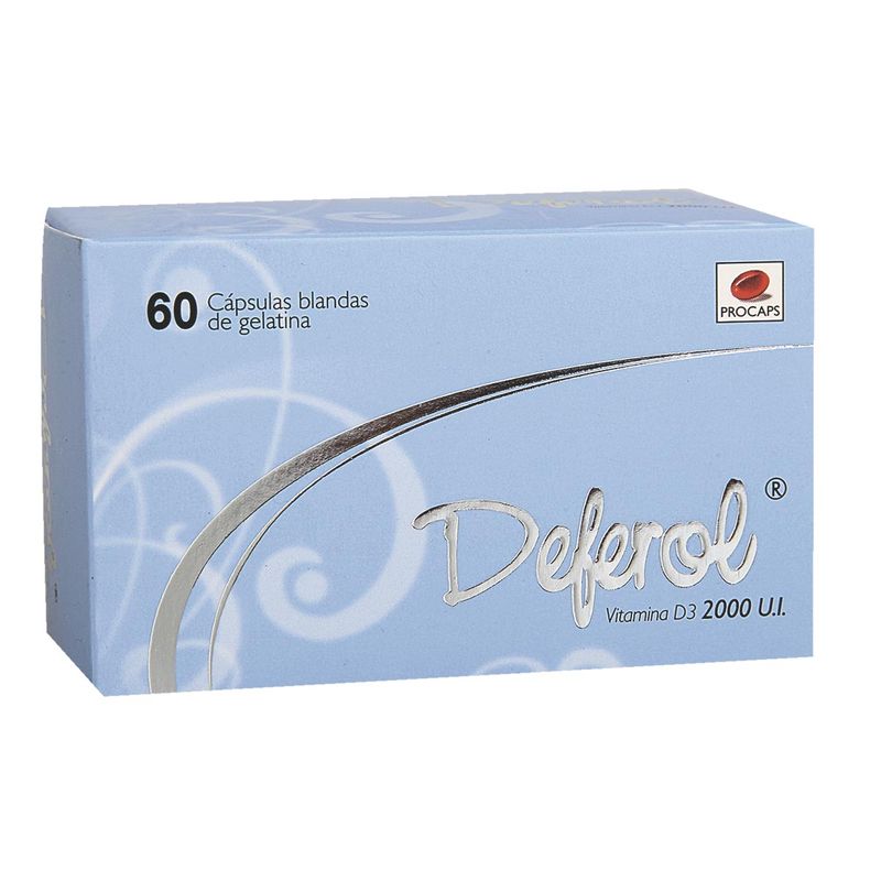 DEFEROL es un suplemento proporcionado por PROCAPS SA, con registro sanitario 2016M-0017442 y presentación en caja de 60 cápsulas. Contiene vitamina D3 como sustancia base y principio activo. Este suplemento de vitaminas está diseñado para fortalecer el sistema inmunológico y mejorar la salud ósea y metabólica.
