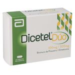 DICETEL DUO 100/300MG TNR CJX24 LFCCaracterísticas y propiedades:Modo de uso, posología o indicacionesComposición, ingredientes o materiales:BROMURO DE PINAVERIO 100 mg; SIMETICONA DC 65% EQUIV DIMETICONA 300mgContraindicaciones, advertencias y Precauciones:Marca comercial del producto:DICETEL DUO X 24 TAB