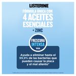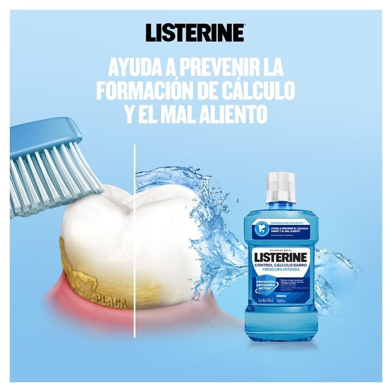 - Con Alcohol. - Sabor intenso. - Previene el cálculo/sarro en los dientes y el mal aliento. - Elimina hasta el 99.9% de las bacterias que causan placa y mal aliento*1. - Mantiene las encías saludables. - Fórmula exclusiva de 4 aceites esenciales. - Ninguna acción antibacteriana es más profunda que la de Listerine®*2. - Protección hasta por 24 horas*3. - Para una boca 5 veces mas saludable*4. - Limpia el 100% de tu boca*5. - Mantiene el aliento fresco. (*1 Estudio in vivo, datos en archivo FCLGBP0028; FCLGBP0048; FCLGBP0026 [zero]). *2 Evaluación realizada en laboratorio aplicando microscopía confocal, comparando Listerine Cool Mint Zero con enjuagues conteniendo hasta 0.075% de CPC y 0,075% CPC y zinc – Estúdio interno 103-159 / Poster IADR Fourre et. Al 2019. *3 Usándolo 2 veces por día. Estudio CLM201600052. *4 Por reducir/eliminar 5X la placa vs sólo uso de hilo y cepillado- JADA,2004. *5 Unido al uso del cepillo y seda dental).