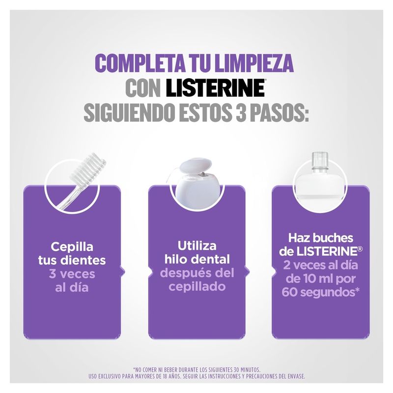 - Con Alcohol. - Sabor intenso. - Ayuda a blanquear y fortalecer los dientes. - Elimina hasta el 99.9% de las bacterias que causan placa y mal aliento*1. - Mantiene las encías saludables. - Fórmula exclusiva de 4 aceites esenciales. - Ninguna acción antibacteriana es más profunda que la de Listerine®*2. - Protección hasta por 24 horas*3. - Para una boca 5 veces mas saludable*4. - Limpia el 100% de tu boca*5. - Mantiene el aliento fresco. (*1 Estudio in vivo, datos en archivo FCLGBP0028; FCLGBP0048; FCLGBP0026 [zero]). *2 Evaluación realizada en laboratorio aplicando microscopía confocal, comparando Listerine Cool Mint Zero con enjuagues conteniendo hasta 0.075% de CPC y 0,075% CPC y zinc – Estúdio interno 103-159 / Poster IADR Fourre et. Al 2019. *3 Usándolo 2 veces por día. Estudio CLM201600052. *4 Por reducir/eliminar 5X la placa vs sólo uso de hilo y cepillado- JADA,2004. *5 Unido al uso del cepillo y seda dental).