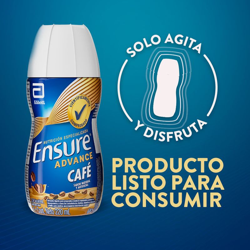 Modo de uso: Disfruta de Ensure Advance Café Solución Oral como parte de tu rutina diaria. Lee detalladamente las instrucciones del empaque antes de usar para obtener mejores resultados. Eleva tu calidad de vida con esta solución oral que te brinda nutrición completa y un delicioso sabor a café.