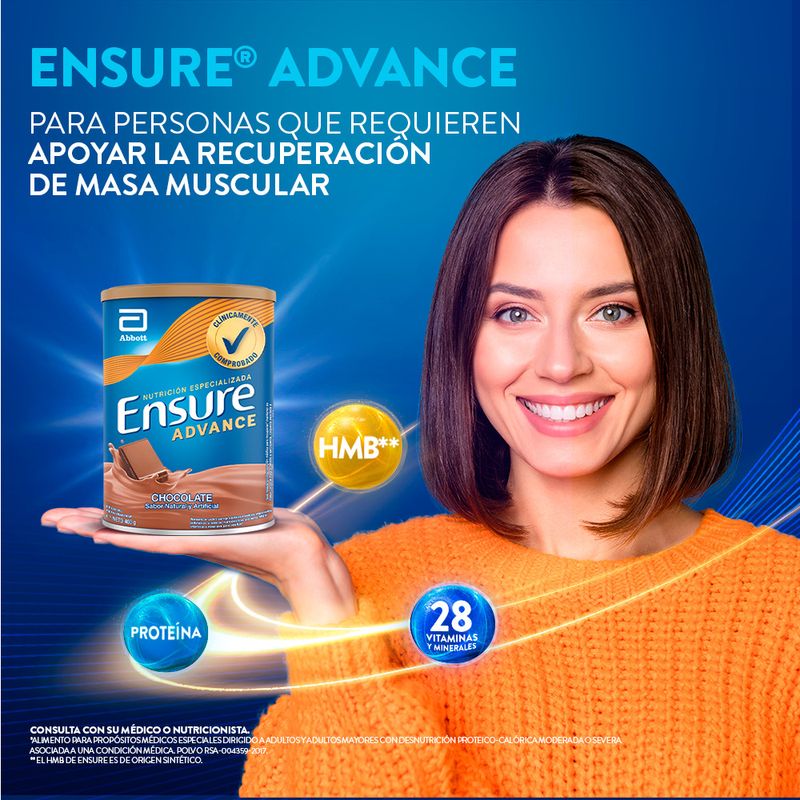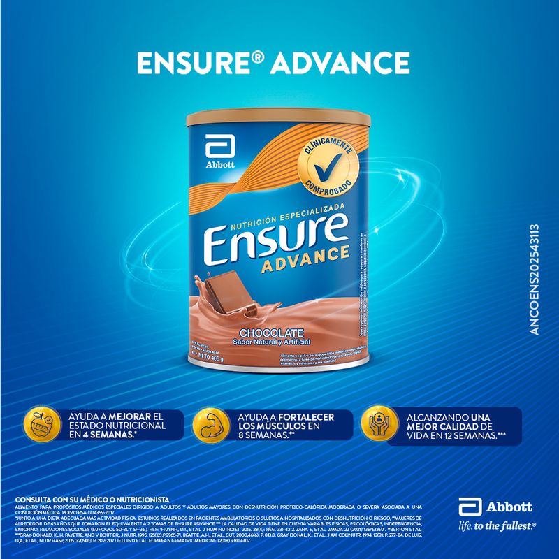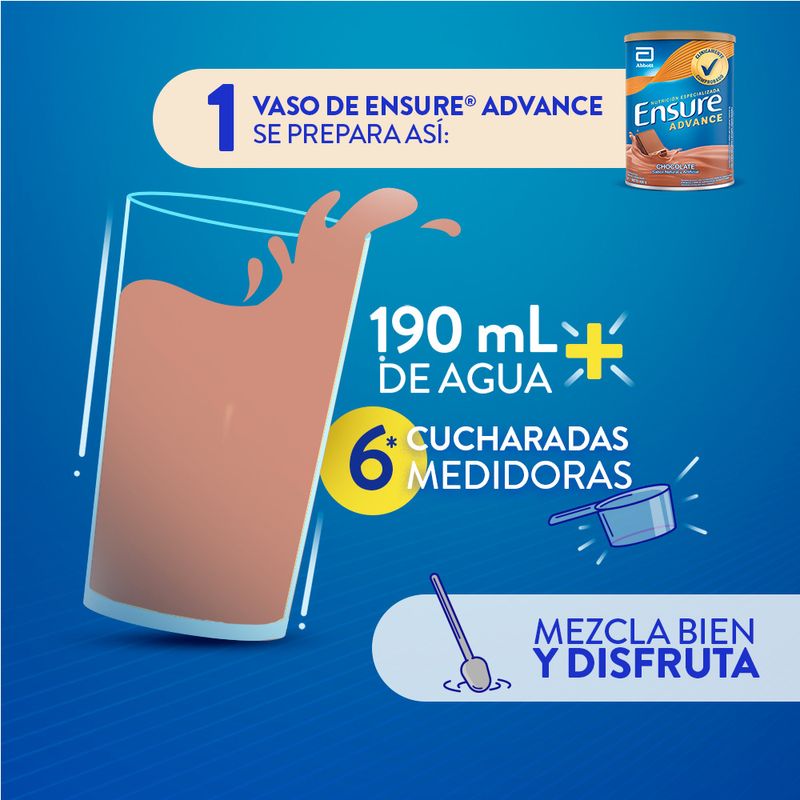 Para aprovechar al máximo estos beneficios, lee detalladamente las instrucciones del empaque antes de usar. Respaldado por el registro sanitario RSA-004359-2017, Ensure Advance Chocolate garantiza la calidad y seguridad que buscas en un producto de nutrición. Prioriza tu bienestar diario con el delicioso sabor del chocolate y la confianza de Ensure.