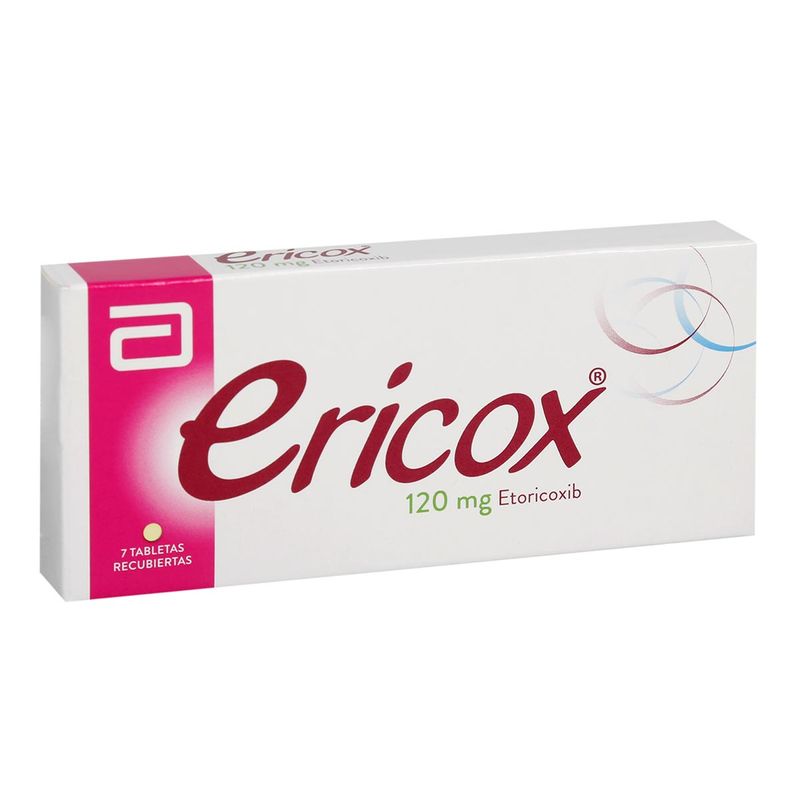 ERICOX 120MG TNR CJX7 LFCCaracterísticas y propiedades:Modo de uso, posología o indicacionesComposición, ingredientes o materiales:ETORICOXIB 120 mgContraindicaciones, advertencias y Precauciones:Marca comercial del producto:ERICOX 120 mg x 7 TAB