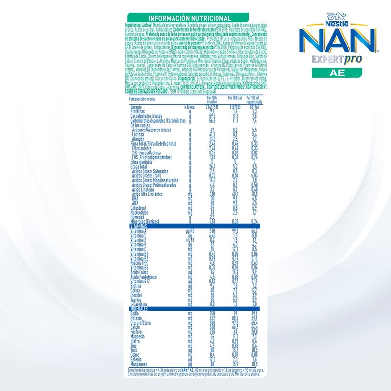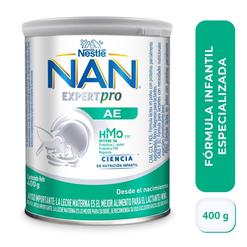 NAN® AE es una fórmula infantil para el manejo nutricional del estreñimiento para lactantes desde el nacimiento. Contiene Proteína OPTIPRO® HA, probiótico L.reuteri, prebióticos FOS y HMO 2'FL, y mayor cantidad de magnesio.