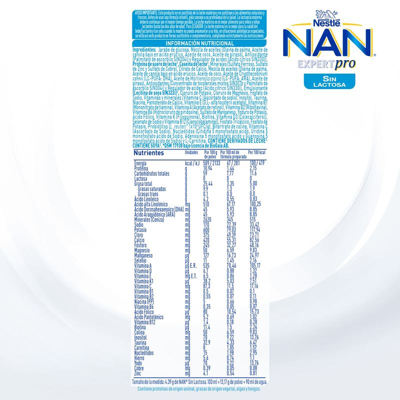 Jarabe de glucosa, mezcla de aceites [Oleína de palma, Aceite de Canola bajo en ácido eúrico, Aceite de Coco, Aceite de Girasol, Antioxidante (Palmitato de ascorbio SN304) y Regulador de acidez (Ácido cítrico SN330)], Proteína de suero de leche, Caseína de leche, Minerales (Sulfato ferroso, Sulfato de zinc y Sulfato de cobre), Citrato de calcio, Mezcla de aceites (Oleína de palma, Aceite de Canola bajo en ácido eúrico, Aceite de Coco, Aceite vegetal de Crypthecodnium cohnil (LC-PUFA-DHA), Aceite vegetal de Mortierella alpina (LC-PUFA-ARA), Aceite de girasol, Antioxidantes (Concentrado de tocoferoles mixtos SN307b y Palmitato de ascorbilo SN304i) y Regulador de acidez (Ácido cítrico SN330)), Emsuilsionante (Lecilina de soya SN322), Cloruro de potasio, Cloruro de magnesio, Fosfato de sodio, Vitaminas y Minerales [Vitamina C (Ascorbato de sodio), Inositol, Taurina, Niacina, Pantotenato de calcio, Vitamina E (D, L-Alfa tocoferil acetato), Vitamina B1 (Mononitrato de tiamina), Vitamina A (Acetato de Retinol), Vitamina B2 (Riboflavina), Vitamina B6 (Hidrodoruro de piriroxina), Sulfato de manganeso, Yoduro de potasio, Ácido fólico, Vitamina K1 (Floquinona), Biotina, Vitamina D3 (Colecalciferol), Selenato de sodio y Vitamina B12 (Sianocobalamina)], Fosfato tricalcico, Fosfato de potasio, Probióticos, Lactobacillus Reuteri 1X106 UFC/g], Bitartrato e colina, Vitamina C (Ascorbato de sodio), Nucleótidos (Citibina 5 manofosfato ácido, uridina 5 monofosfato ácido de socio, adenosina 5 monofosfato ácido y guanocina 5 monofosfato ácido de sodio y L-Camitina.