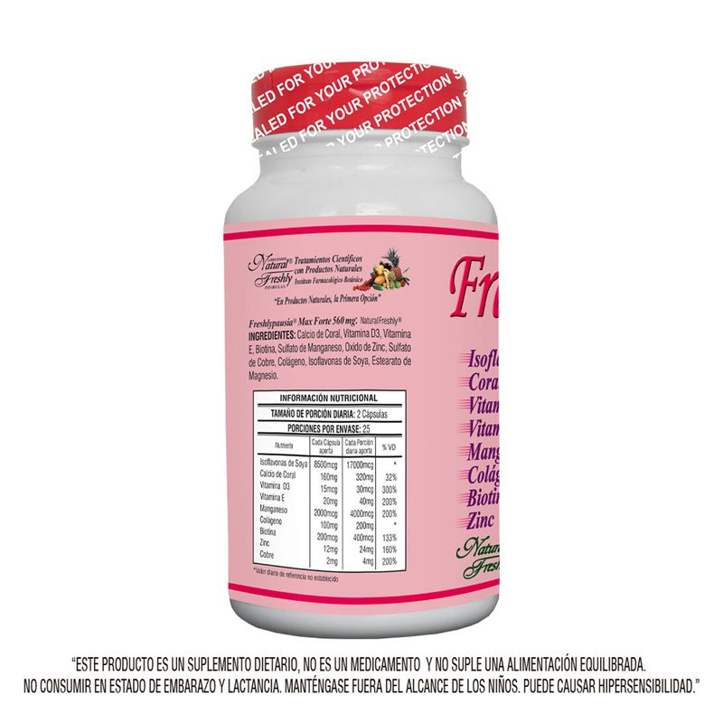Freshlypausia Max Forte Isoflavonas CALCIOFCX50CAP Trata y controla los molestos sintomas de la menopausia,controla sintomas de la menopausia sin riesgo de la terapia de remplazo hormonal,resequedad vaginal,reduce el riesgo de cardiopatia, evita el desgaste muscular,previene la anemia al contibuir en el trasnporte de hiero en sangre,evita la oxidación de las celulas por radicales libres Modo de uso: adultos -1 capsula dos veces al dia. Ingredientes: calcio coral, vitamina d3, vitamina e, biotina, manganeso, colágeno, zinc, isoflavonas de soya CONTRAINDICACIONES Y ADVERTENCIAS: MANTEGASE FUERA DEL ALCANCE DE LOS NIÑOS, CANCER DE MAMA,PROBLEMAS DE TIROIDES, MUEJERES EN ENTADO DE AMBARZO O LACTANCIA Freshlypausia