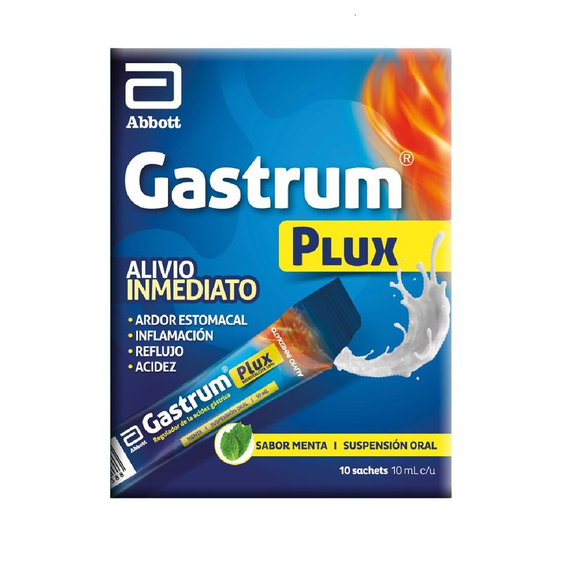GASTRUM PLUX 10% SSN MENTA CJX10SOBX10MCaracterísticas y propiedades:Alivio inmediato del Reflujo, Ardor Estomacal, acidez e inflamación. Modo de uso, posología o indicacionesAgitar el sachet antes de usar. Tomar 1 sachet de suspensión oral al presentarse las molestias estomacales. Para un uso regular tomar la dosis media hora después de cada comida y antes de acostarse. Niños de 6 a 12 años: Tomar la mitad de la dosis de los adultos. No administrar en niños menores de 6 años. VÍA DE ADMINISTRACIÓNComposición, ingredientes o materiales:HIDROTALCITA MICROFINA 10 g/100 mLContraindicaciones, advertencias y Precauciones:Es un medicamento. No exceder su consumo. Si los síntomas persisten consulte a su médico. Leer indicaciones y contraindicaciones en el inserto. Analgésico, Antipirético.Marca comercial del producto:GASTRUMMedidas:2,8x14x10,8 cmPeso:138,2 G