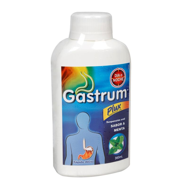 GASTRUM PLUX 10% SSN MENTA FCOX360ML LFCCaracterísticas y propiedades:Alivio inmediato del Reflujo, Ardor Estomacal, acidez e inflamación. Modo de uso, posología o indicacionesOral, 500-1.000 mg 3-4 veces/día 1-2 h después de las comidas, antes de acostarse o al sentir molestias. Máx. 6 g/día.Composición, ingredientes o materiales:HIDROTALCITA MICROFINA 10 g/100 mLContraindicaciones, advertencias y Precauciones:Es un medicamento. No exceder su consumo. Si los síntomas persisten consulte a su médico. Leer indicaciones y contraindicaciones en el inserto. Analgésico, Antipirético.Marca comercial del producto:GASTRUMMedidas:5,1x7,6x15,3 cmPeso:433 G