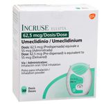 INCRUSE ELLIPTA 62.5MCG POI INHX30DOS, suministrado por GLAXOSMITHKLINE COLOMBIA SA con el registro sanitario 2016M-0017469, es un medicamento indicado para el tratamiento de enfermedades respiratorias, específicamente enfermedad pulmonar obstructiva crónica (COPD) y asma. Con la sustancia base de umeclidinio bromuro, este producto ofrece beneficios significativos para mejorar la función respiratoria y aliviar los síntomas asociados. Experimente una mejor calidad de vida y gestión eficaz de las afecciones respiratorias con INCRUSE ELLIPTA.
