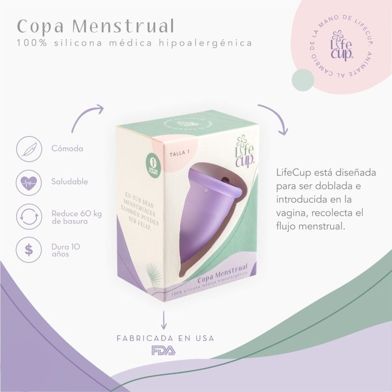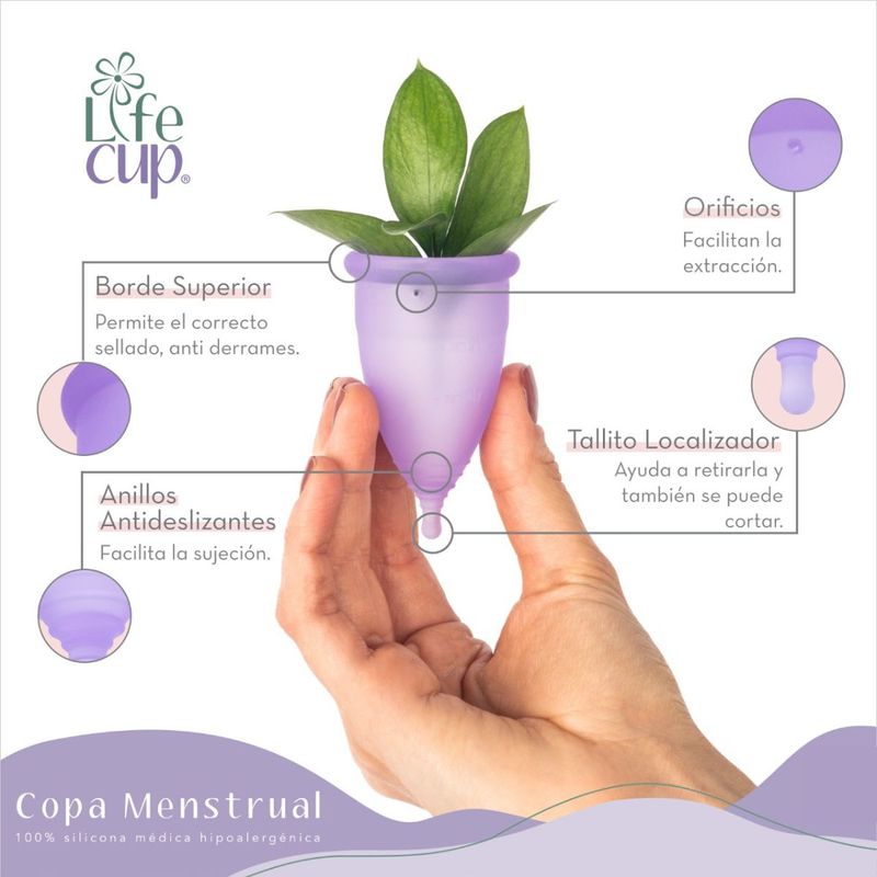 LifeCup Copa Menstrual es un dispositivo de silicona médica reutilizable, para la higiene en los días menstruales. Está diseñada para ser doblada e introducida en la vagina para recolectar el flujo menstrual. Una vez dentro queda fijada gracias a los músculos, y su función es recolectar el flujo menstrual.