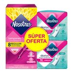 La oferta Tampón Nosotras Aplicador Regular x 8 + 2 Protectores Largos x 10, presentada en una caja con 8 tampones y 10 protectores largos por Productos Familia SA, te brinda una solución completa para tu protección femenina.