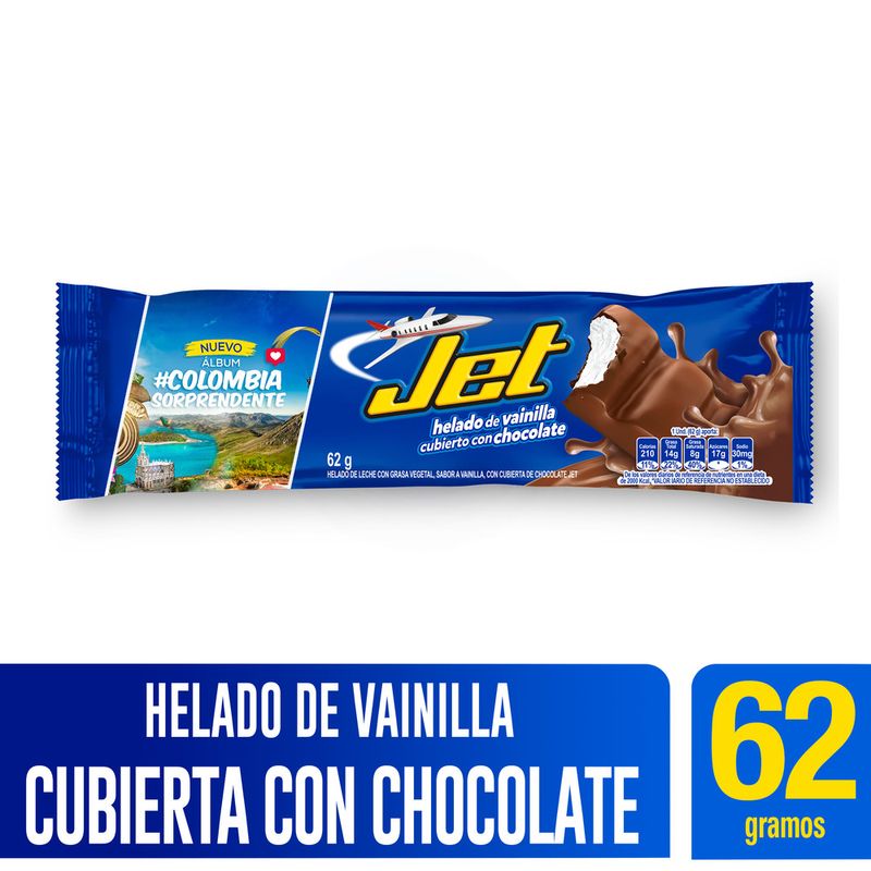 Leche, Azúcar, Leche en Polvo descremada, grasa vegetal, glucosa, maltodextrina, emulsificante - estabilizante (mono y diglicéridos de ácidos grasos, Goma de algarrobo, goma celulósica, carragenina), saborizantes Artificiales. Cobertura de Chocolate Jet: Licor de chocolate, azúcar, leche, manteca de cacao, emulsionante (lecitina de soya), Saborizantes Artificiales.