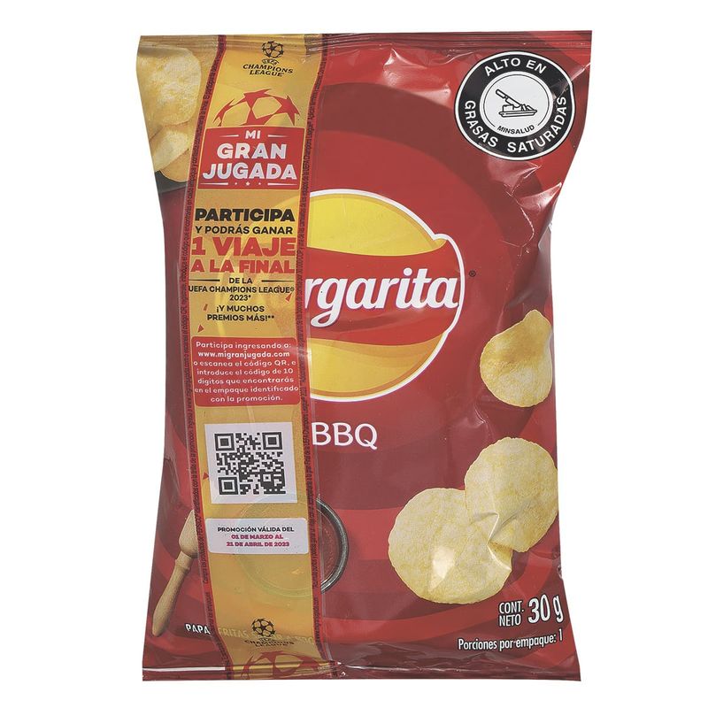 Papas Margarita BBQ te ofrecen una explosión de sabor, crocancia y calidad en cada bocado. Estas deliciosas papas fritas cultivadas por los agricultores colombianos, se preparan y sazonan de manera perfecta, ofreciéndote el más exquisito e intenso sabor a barbacoa (BBQ) en cada chip. Son una excelente opción tanto para aquellos que buscan un snack delicioso y lleno de sabor, como para aquellos que quieran llevar sus recetas a otro nivel, incluyéndolas como ingrediente de sus preparaciones del día a día para agregar el sabor único del BBQ con papas Margarita a sus preparaciones. Las Papas Margarita BBQ son intensas, versátiles y deliciosas para su consumo en cualquier momento del día.