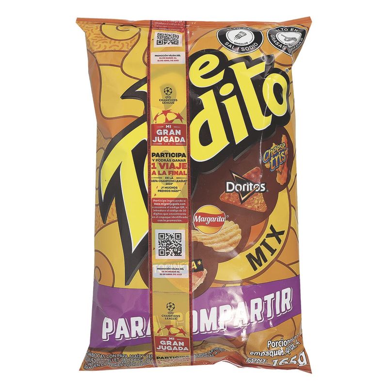 ¡Descubre deliciosas mezclas en cada paquete de DeTodito! Esta mezcla de snacks es perfecta para calmar tu hambre entre comidas y satisfacer todos tus antojos en un solo paquete. DeTodito es una mezcla de sabores, marcas favoritas y texturas que te emocionarán en cada bocado. En DeTodito encontrarás la mezcla de tus marcas favoritas: Papas margarita, Doritos, Natuchips, Cheese Tris, Cheetos, Tostitos y Chicharrón Americano Jacks en cada bocado. Ideal para comértelo y compartir en cualquier momento, mientras trabajas, estudias, celebras con amigos o mientras te movilizas en la ciudad. Prueba todos sus deliciosos sabores; BBQ, NATURAL, MIX, LIMÓN y FLAMIN HOT ¡Prueba la mezcla perfecta que tiene algo para todos!