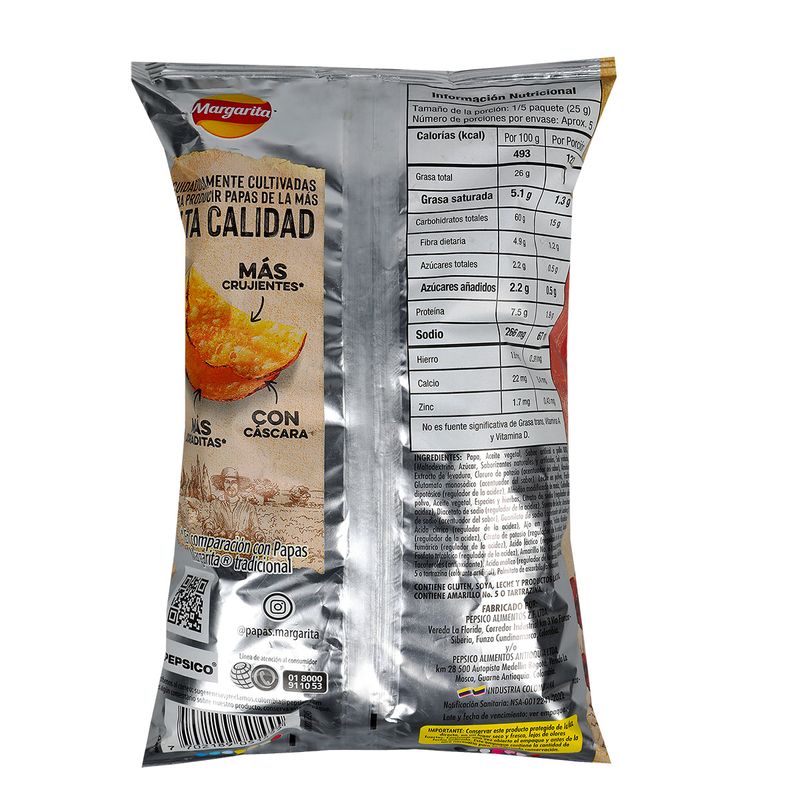 Papas Margarita Receta Clásica: Alitas Pollo BBQ son la elección perfecta para los amantes del delicioso sabor a pollo con el dulce toque de la salsa BBQ, ¡Son más crocantes, gruesas y con cascarita! La elección perfecta para los amantes de los sabores intensos, deliciosos y cárnicos con un toque dulce. Con la presencia protagónica de la cáscara de la papa y su cocción artesanal se obtiene una crocancia inigualable . Son perfectas para consumir en cualquier momento del día, para compartir con amigos, para saciar un antojo o incluso para incluirla como ingrediente en tus recetas y sazonarlas con la sabrosura de Margarita. ¡No te quedes sin probarlas!