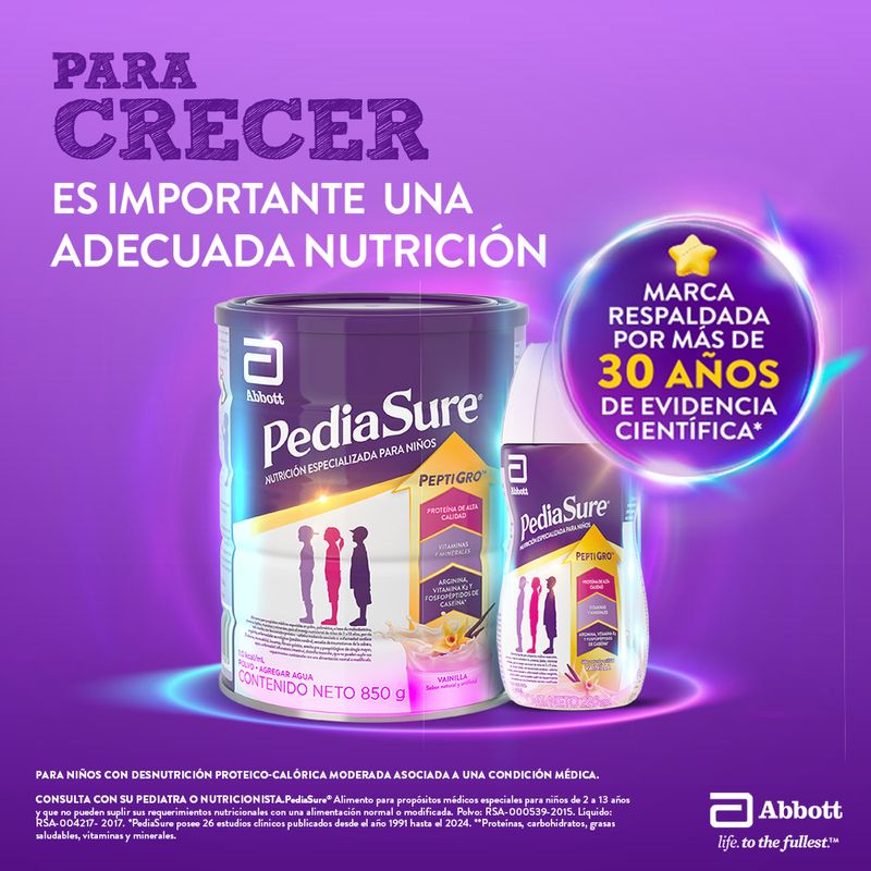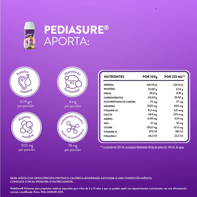 Beneficios: Pediasure ofrece una fórmula equilibrada que suministra vitaminas, minerales y nutrientes esenciales para el desarrollo óptimo de los niños. Contribuye al fortalecimiento del sistema inmunológico y proporciona la energía necesaria para sus actividades diarias.