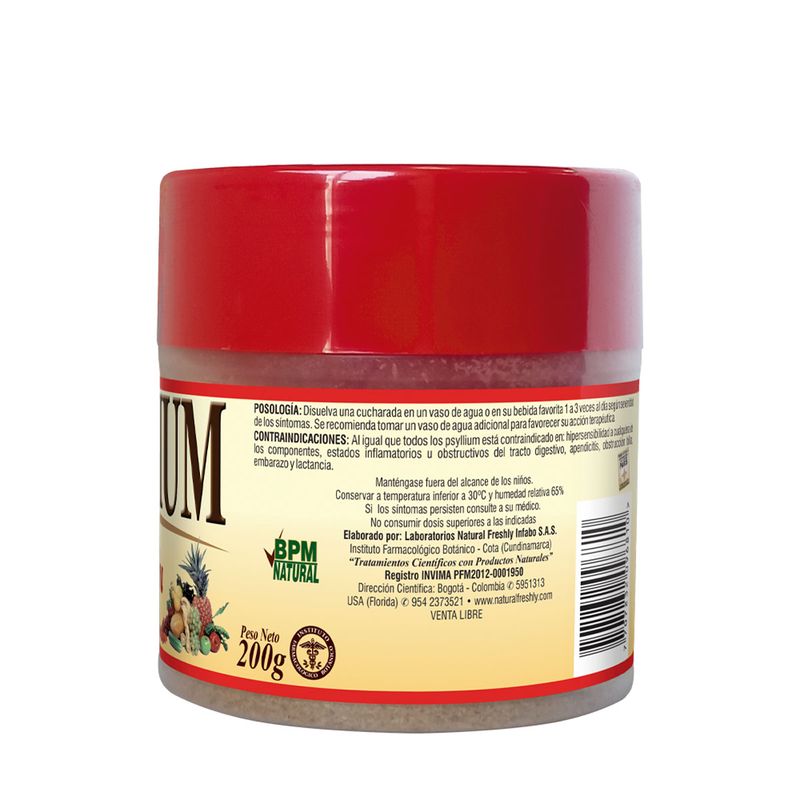Psyllium Fibra Natural Laxante x 200 G Producto natural a base de fibra de acción laxante Disuelva una cucharada en un vaso de agua o en su bebida favorita uno a tres veces al día según severidad de los síntomas se recomienda tomar un vaso de agua adicional para favorecer su acción terapéutica Plantago psyllium AL IGUAL QUE TODOS LOS SILIUMS ESTÁ CONTRAINDICADO EN HIPERSENSIBILIDAD A CUALQUIERA DE SUS COMPONENTES ESTADOS INFLAMATORIOS U OBSTRUCTIVOS DEL TRACTO DIGESTIVO APENDICITIS OBSTRUCCIÓN BILIAR EMBARAZO Y LACTANCIA Psyllium fibra