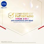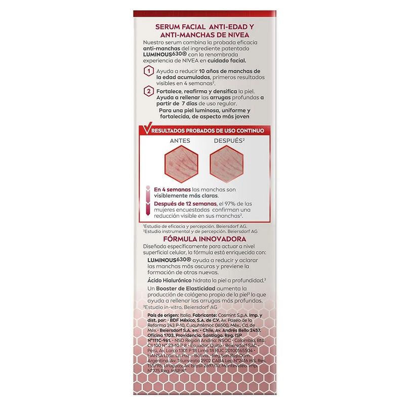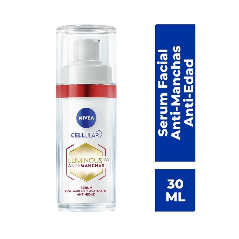 NIVEA CELLULAR LUMINOUS SERUM ANTI-EDAD Y ANTI-MANCHAS es un serum que combina la Comprobada eficacia de LUMINOUS630 con la renombrada experiencia de NIVEA en cuidado facial. Complementa tu rutina de skincare con el serum aclarador de manchas de textura ligera, de rápida absorción, que tiene la mayor eficacia en el tratamiento de manchas gracias a su triple acción: Reduce manchas por edad. Densifica la piel gracias al colágeno en su fórmula. Rellena las arrugas profundas gracias a su fórmula con ácido hialurónico. El altamente efectivo LUMINOUS 630, actúa a nivel superficial celular, equilibrando la producción de melanina para ayudar a prevenir la aparición de nuevas manchas y unificar el tono natural de la piel, aumentando su luminosidad. Su fórmula ligera es suave con tu rostro y es recomendado para todo tipo de piel. Ayuda a reducir 10 años de manchas de la edad acumulada primeros resultados visibles en 4 semanas. Fortalece, reafirma y densifica la piel.