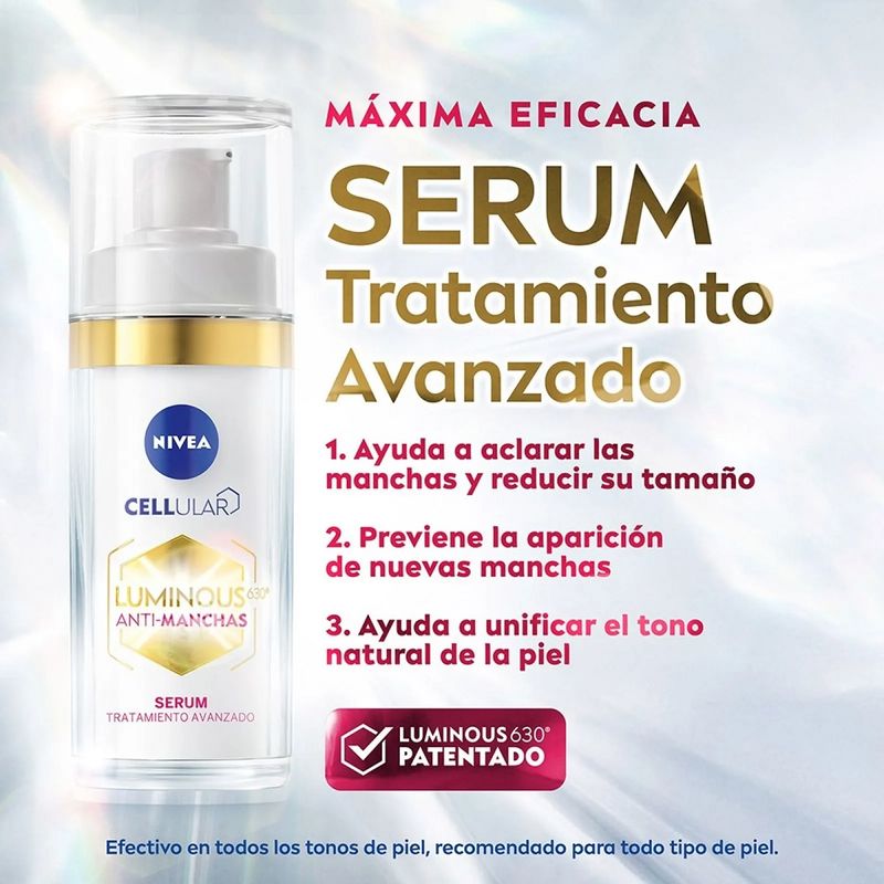 Complementa tu rutina de skincare con el serum aclarador de manchas de textura suave y ligera, de rápida absorción, que tiene la mayor eficacia en el tratamiento de manchas gracias a su acción dual: La crema aclaradora de manchas activa la pigmentación existente para aclarar las manchas y reducir su tamaño. Equilibra la producción de nueva melanina para prevenir la aparición de nuevas manchas. El altamente efectivo LUMINOUS 630, actúa a nivel superficial celular, equilibrando la producción de melanina para ayudar a prevenir la aparición de nuevas manchas y unificar el tono natural de la piel, aumentando su luminosidad. Su fórmula ligera es suave con tu rostro y es recomendado para Todo tipo de piel. Cómo se Usa: 1. Aplica la crema aclaradora de manchas diariamente sobre el rostro limpio, por la mañana y por la noche antes de tu rutina facial. 2. Extender el serum facial aclarador de manchas por toda la cara. 3. Complementar por la mañana con LUMINOUS630® fluido anti manchas facial de día FPS 50 para ayudar a evitar la reaparición de manchas. Usar la crema aclaradora de manchas un máximo de 4 veces al día. Resultados: Manchas visiblemente más claras con el uso regular. Activa la pigmentación existente para aclarar las manchas y reducir su tamaño. Equilibra la producción de nueva melanina para prevenir la aparición de nuevas manchas. Ideal para Todo tipo de piel, incluso Piel sensible.