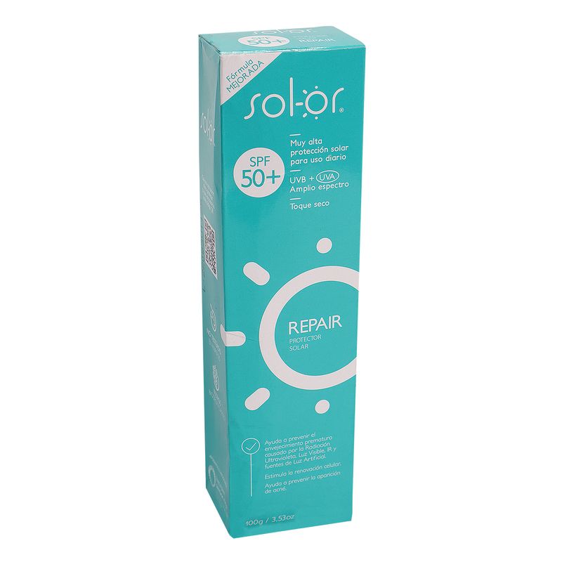 Solor repair spf 50+ x 100g, protector solar en crema gel de uso diario para piel mixta , sin efecto borrador con cosmetica suave, de facil aplicación, toque seco, sin dejar sensación pegajosa ni efecto mimo.gracias a su contenido de glicorepair- extracto de semilla de algarrobo: estimula la renovación celuar de la piel, recuperando el ciclo natural y permitiendo homogenizar la textura proporcionando un aspecto juvenil.