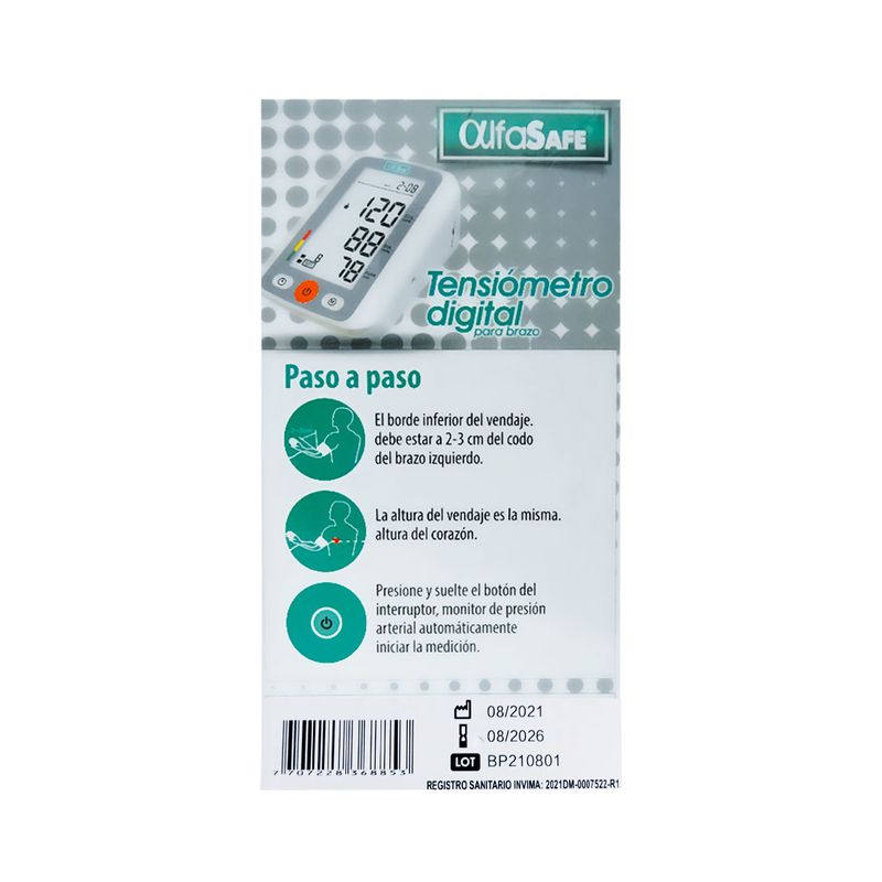 El Tensiómetro Digital Brazo ALFASAFE ® / Monitor de presión arterial es utilizado para la medición de la presión arterial, utilizando el método oscilo métrico electrónico automático diseñado para uso en casa para supervisar y mostrar la presión para personas que requieren que esta sea controlada, o por profesionales de la salud.