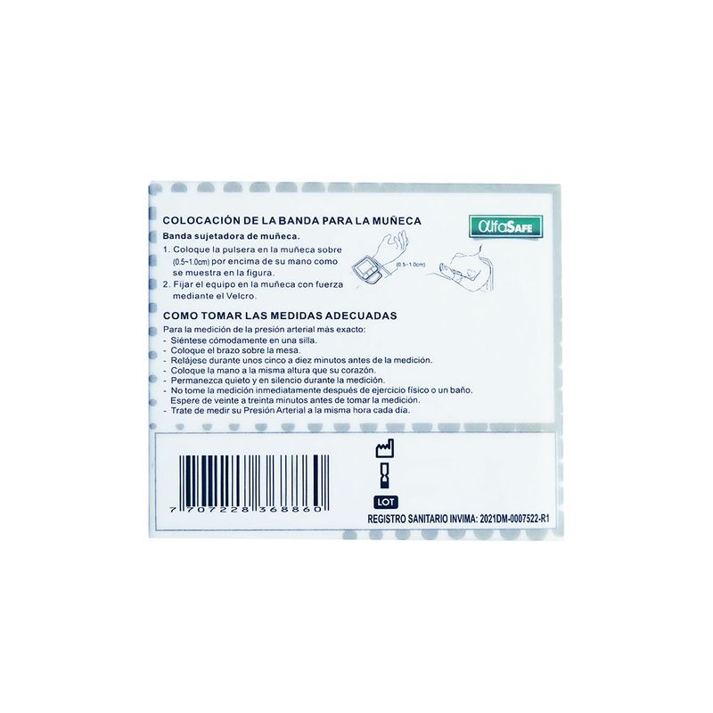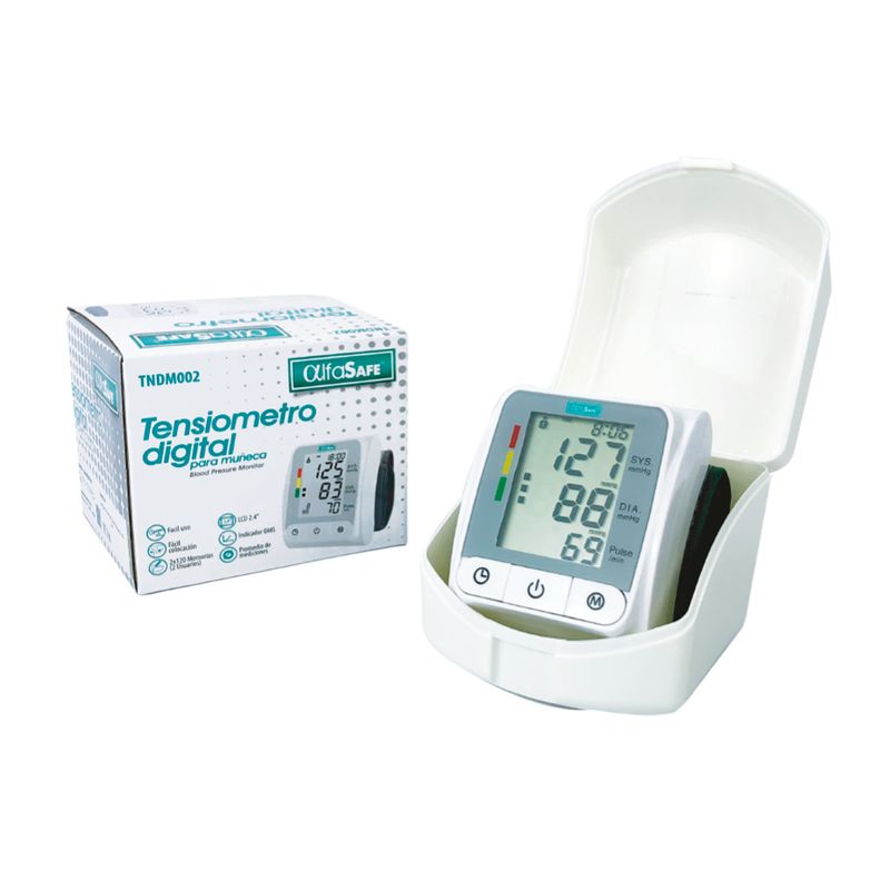 El Tensiómetro de Muñeca ALFASAFE ® / Monitor de presión arterial es utilizado para la medición de la presión arterial, utilizando el método oscilo métrico electrónico automático por medio de un brazalete que rodea el brazo izquierdo. Diseñado para uso en casa para supervisar y mostrar la presión para personas que requieren que esta sea controlada, o por profesionales de la salud.