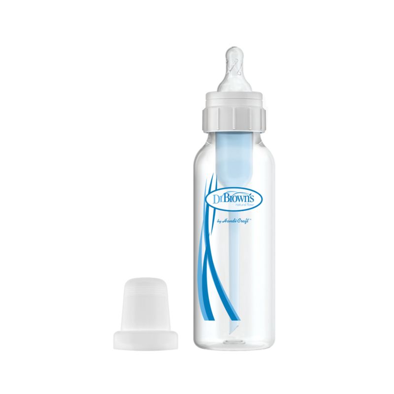 Tetero Natural Flow de 8 onzas, diseño tradicional, con un sistema de ventilación interno diseñado para evitar el vacio y la ingesta de aire y así disminuír el vómito, los eructos y gases, promoviendo una alimentación más feliz, además preserva los nutrientes en la leche materna y de fórmula, mejora y facilita una buena digestión. El sistema de ventilación interna anticólicos de los teteros Dr. Brown's está clínicamente probado para reducir los cólicos, brindan una experiencia de alimentación más cómoda para el bebé al disminuir las regurgitaciones, los eructos y los gases.