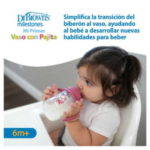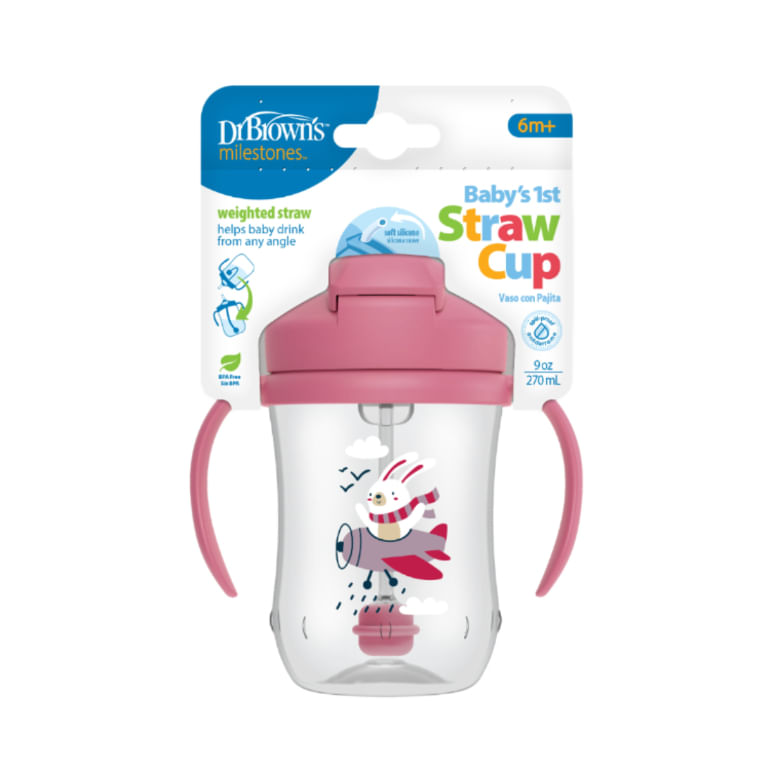 Vaso pitillo 9 Oz con pitillo con pesa, permite al bebé tomar todo el liquido del vaso desde cualquier ángulo para aprovechar todo el contenido, facilita la transición de biberón a vaso y que el bebé aprenda a succionar con pitillo, además tiene cierre hermético que evita derrames accidentales, con asas para facilitar al bebé sostenerlo.